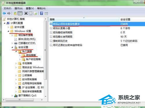 2. 在打开的组策略编辑器界面中,需要依次点击左侧栏中的“计算机配置——windows设置——安全设置——账户策略——密码策略”,随后双击打开右侧中的“密码必须符合复杂性要求”。