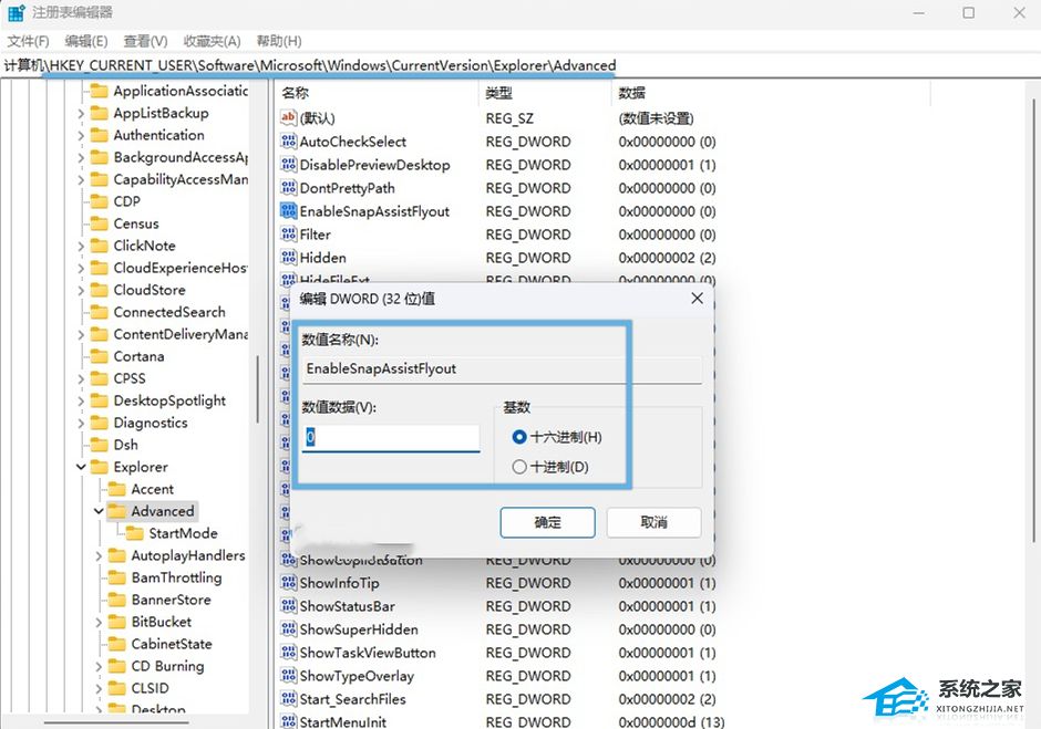 3. 双击名为 EnableSnapAssistFlyout 的 DWORD(32位)值,根据需要设置其值为: