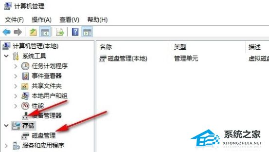 2. 进入计算机管理页面之后,打开“存储”选项,在存储下方打开“磁盘管理”选项。