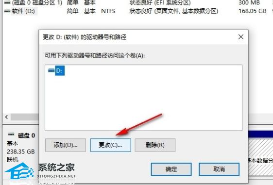 4. 打开“更改驱动器号和路径”选项之后,在弹框中找到“更改”选项,点击打开该选项。