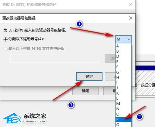 5. 在“更改驱动器号和路径”弹框中打开“分配以下驱动器号”选项,选择好自己需要的驱动器号,再点击确定选项即可。