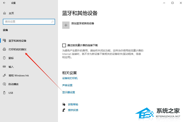 2. 在打开的新界面中,需要点击左侧栏中的“打印机和扫描仪”选项。