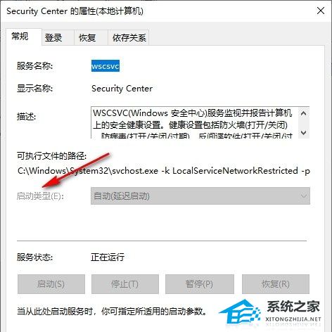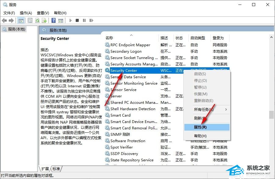 4. 我们双击打开“Security Center”服务,或是右键单击“属性”选项,进入“Security Center”属性页面。