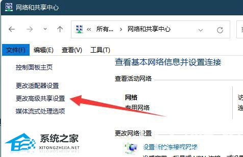 3. 在打开的窗口中,点击左侧栏中的“更改高级共享设置”选项。
