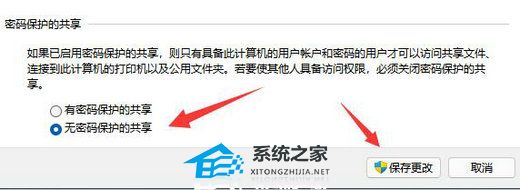 4. 然后找到底部“密码保护的共享”一栏中的“无密码保护的共享”,将其勾选上,最后点击“保存更改”就可以了。