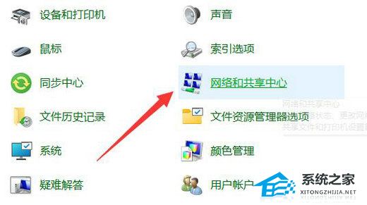 2. 进入到新界面后,找到其中的“网络和共享中心”选项打开。