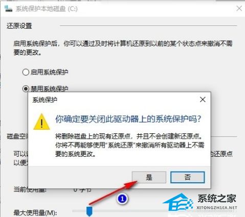 4. 打开“配置”选项之后,在还原设置下点击“禁用系统保护”选项,在确定关闭系统保护的弹框中点击“是”选项,确定保存即可。