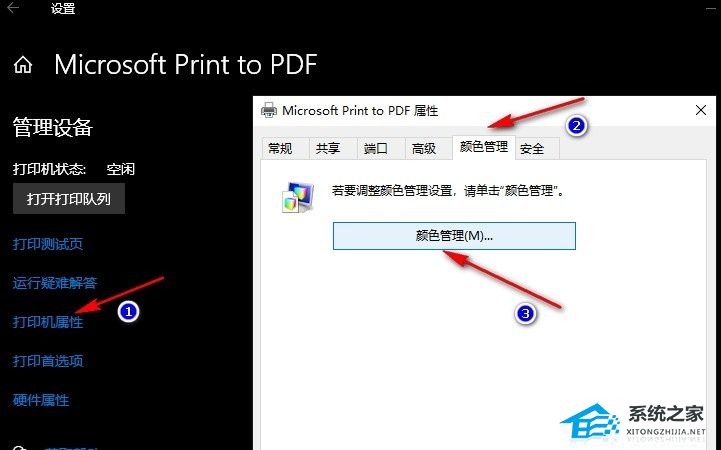 4. 进入打印机页面之后,我们先点击打开“打印机属性”选项,然后在弹框中打开“颜色管理”选项。