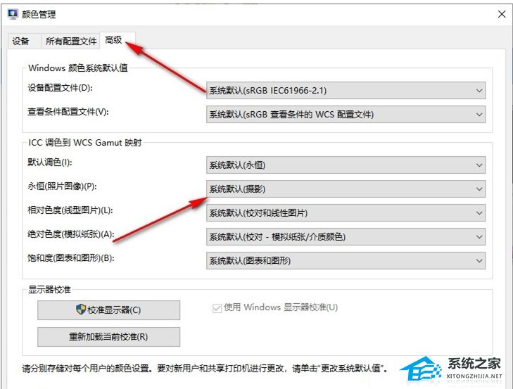 5. 最后我们在颜色管理的高级设置页面中将所有设置都更改为“系统默认”,再点击“关闭”选项即可。