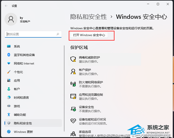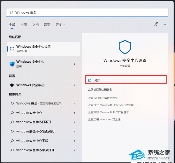 2. 进入到主页面之后,找到并点击右侧中的“打开Windows安全中心”选项。