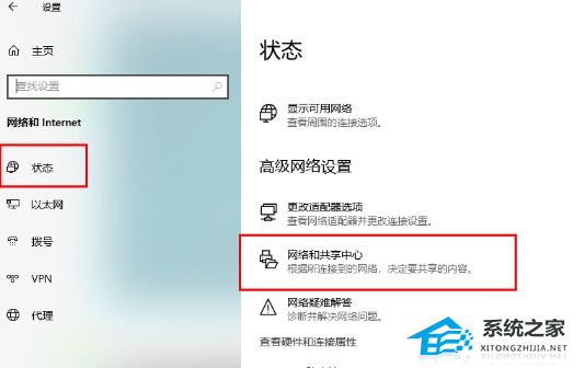 3. 在【状态】选项的页面下,找到【网络和共享中心】选项进行点击进入。