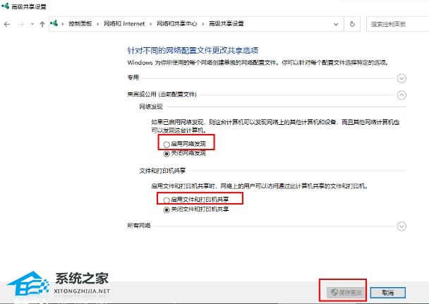5. 勾选【启用网络发现】和【启用文件和打印机共享】选项,之后的点击保存更改按钮即可。