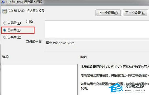 双击右侧的“删除CD刻录功能”设置,在弹出的窗口中选择“已启用”,点击“应用”和“确定”即可。