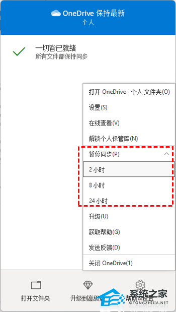 2. 在展开的窗口中点击“暂停同步”,然后根据需要选择暂停同步的时间段。
