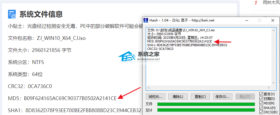 6. 将工具提供的MD5校验值与系统之家提供的系统文件信息MD5校验值进行对比,两者数值相同,系统下载正确,如数值不同则系统下载错误,如下图。