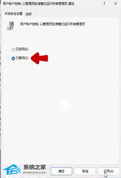 9. 选择“已禁用”,随后点击“应用和确定”。