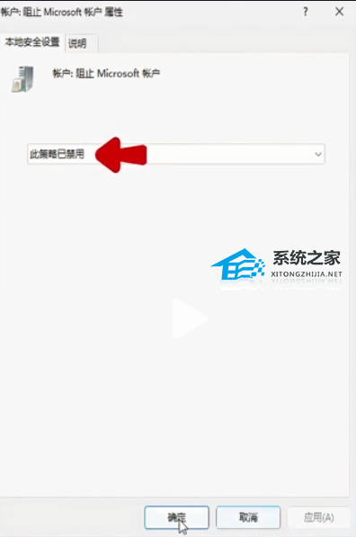 11. 打开属性之后,下拉框选择“此策略已禁用”随后点击“应用和确定”。