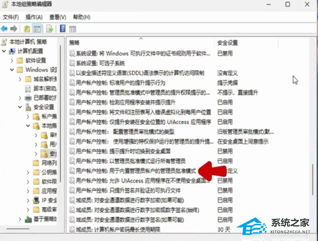 6. 下拉列表,找到“用户账户控制”的相关选项中的“用于内置管理员账户的管理员批准模式”双击打开。