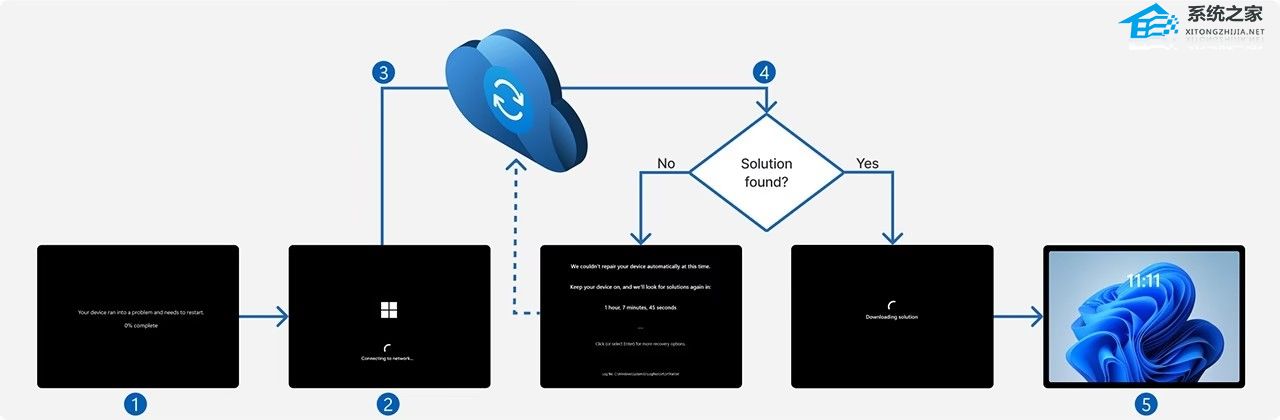 在启用「快速计算机恢复」功能之后,Win11 的整个修复过程将按以下步骤自动执行: